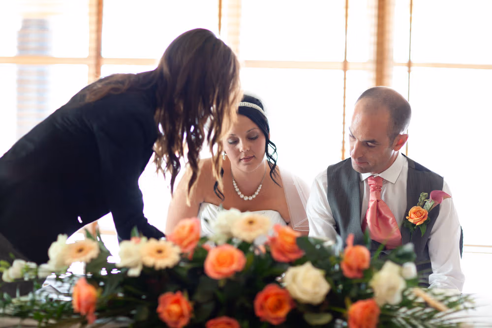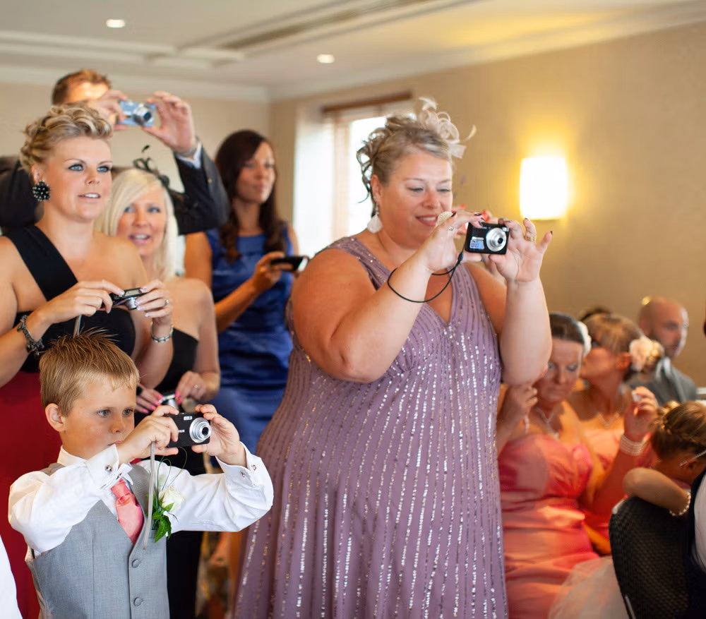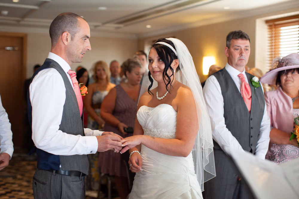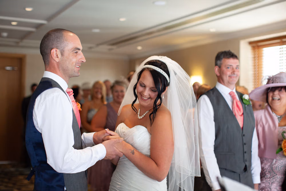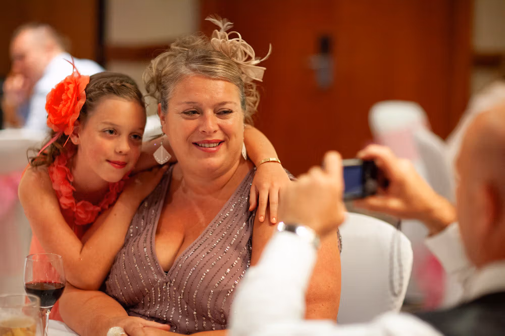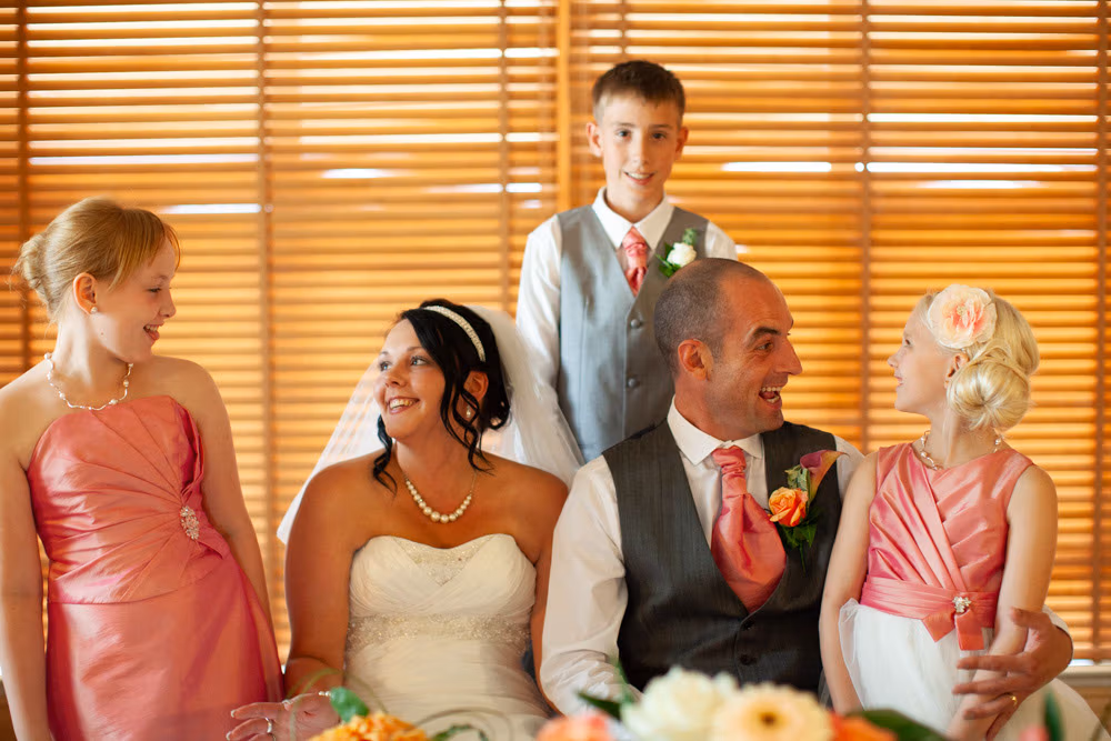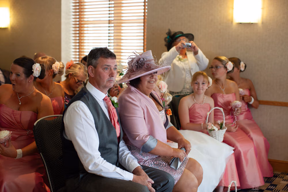 With the blinds half open, a soft, misty light filled the room as Gemma and Dave signed the register. Family and friends leaned in close, smiling, snapping photos, and soaking up the happiness of the moment. Their children joined them too, making the family portraits at this stage extra special — full of hugs, laughter, and pride.