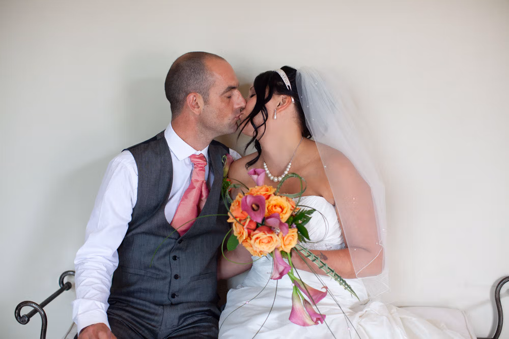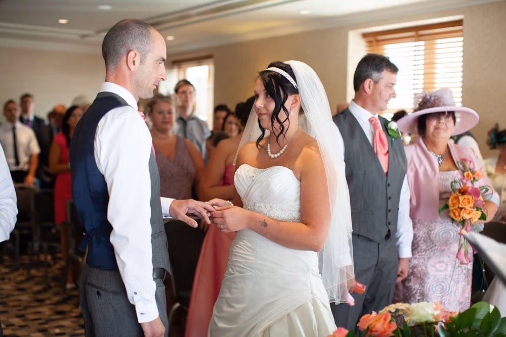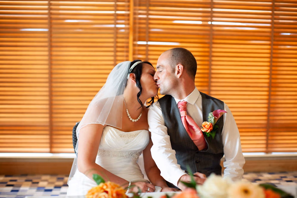 Once the register was signed, everyone flowed into the adjoining room — a space alive with chatter, smiles, and that first wave of post-ceremony relief. I caught Gemma and Dave sharing a quiet kiss in the middle of it all, a little pause just for them.