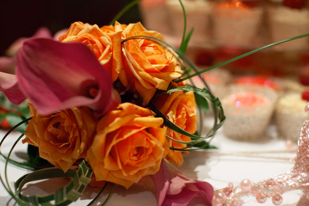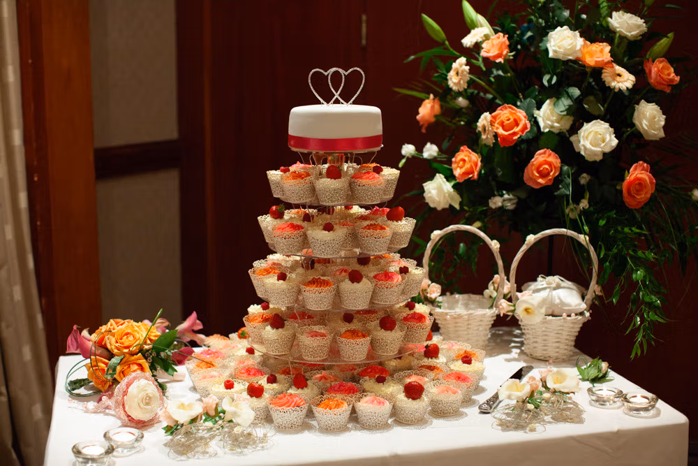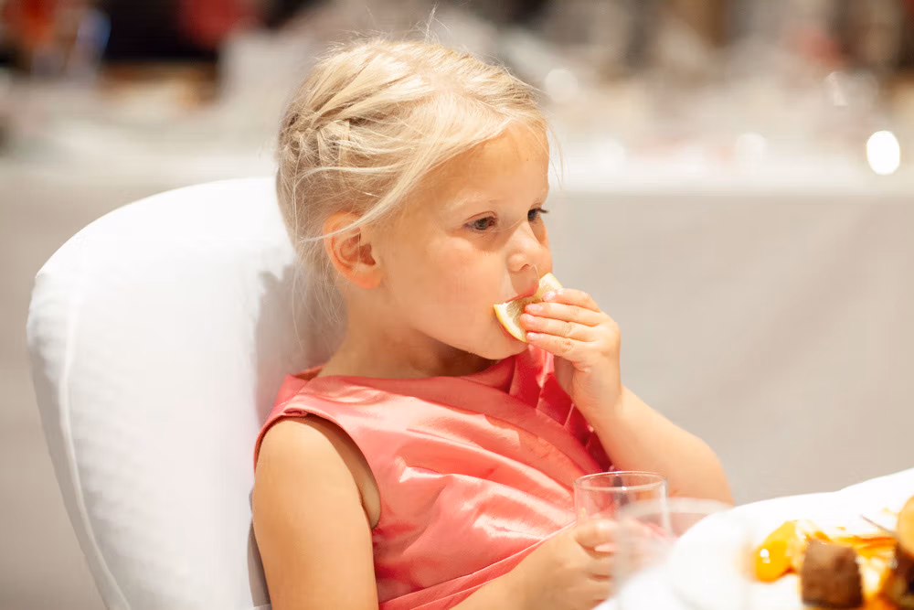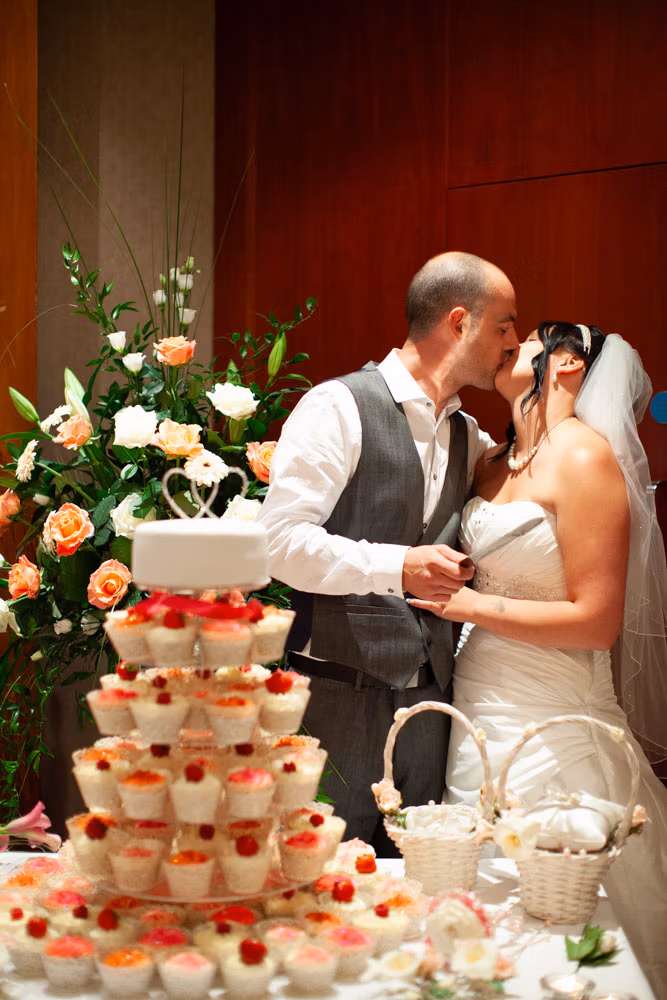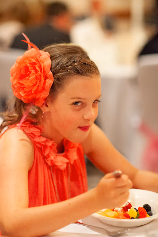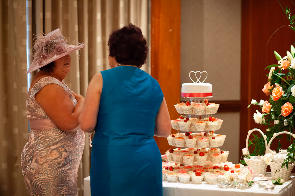 The wedding breakfast began with thoughtful little details — table settings, cake decorations, and a sweet moment as their daughter carefully buckled her shoes. Guests chatted warmly while the room filled with laughter and energy.