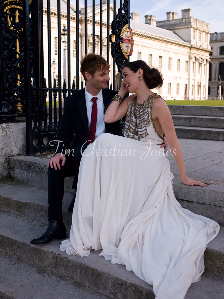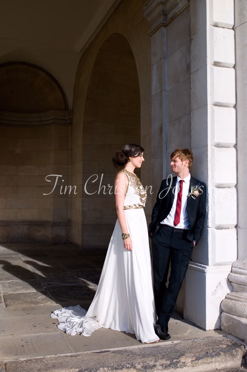Just beyond the ceremony room, white walls and paintings made the perfect backdrop for relaxed family groups. The air was full of warmth and laughter — every frame natural and easy. Nothing posed, nothing forced. Afterwards, we stepped out into the cool afternoon at Greenwich University, where Kat and Jamie braved the breeze for portraits among the grand stone arches and riverside views. Every direction offered something timeless — a calm, elegant close to a day filled with joy.