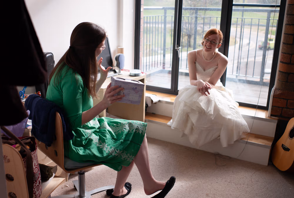 Sat on the window sill, dressed and smiling, Catherine looked radiant as she chatted with her friend. These natural moments — calm, intimate, and full of anticipation — set the perfect tone before heading to St George’s Church in Leeds.