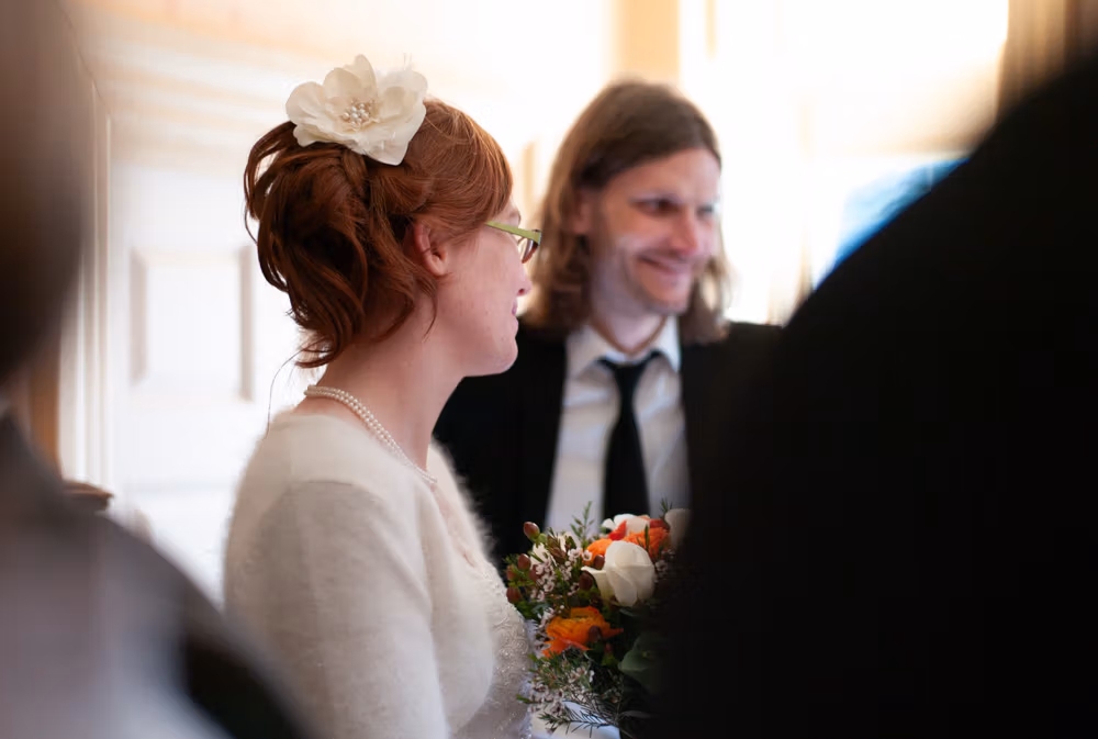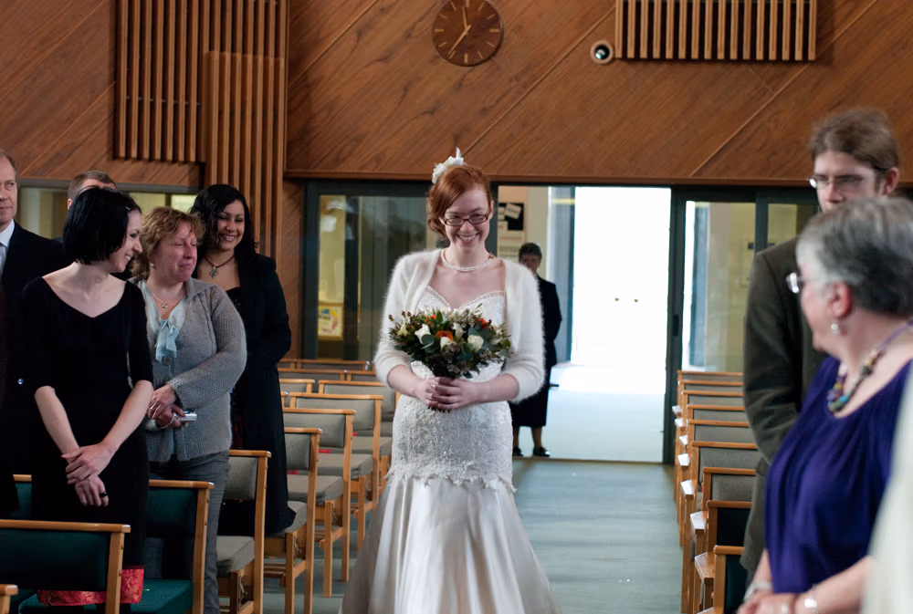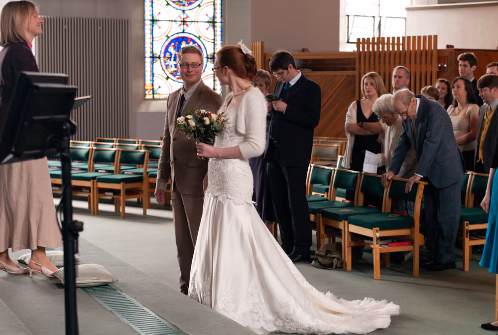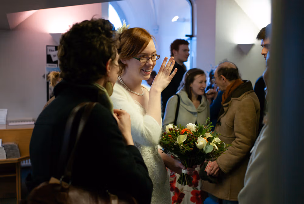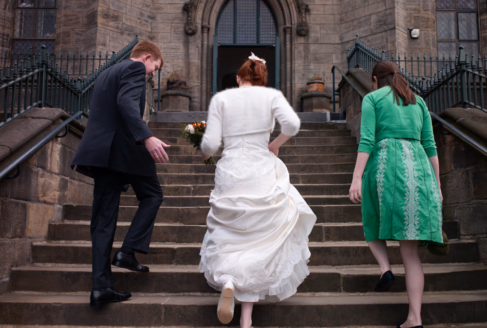Catherine arrived in style, her bright red car a perfect match for her hair and bouquet. At the steps of St George’s in Leeds, she shared warm smiles with her father and best friend before making her way inside. Guests were already filling the pews, the atmosphere alive with quiet anticipation.