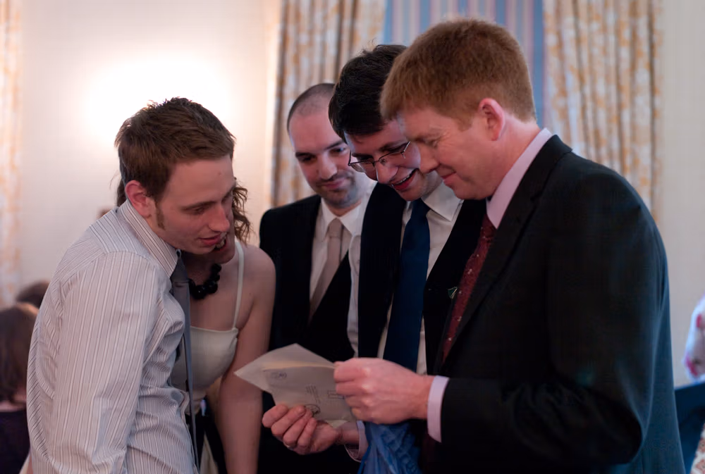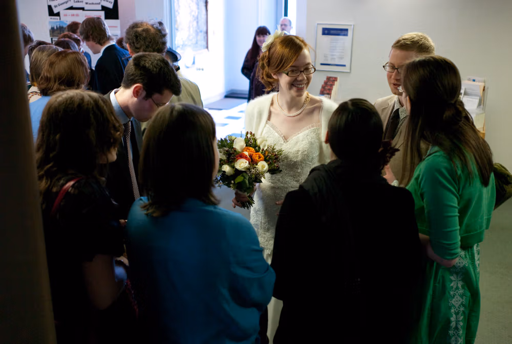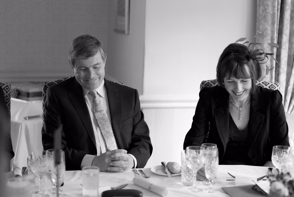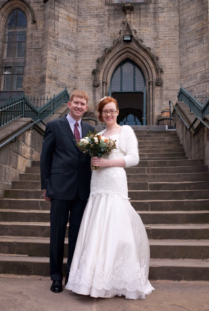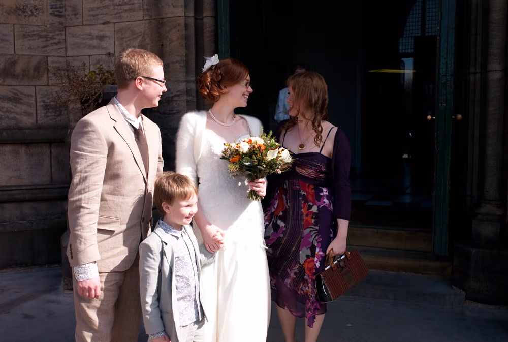 Catherine arrived in style, her bright red car a perfect match for her hair and bouquet. At the steps of St George’s in Leeds, she shared warm smiles with her father and best friend before making her way inside. Guests were already filling the pews, the atmosphere alive with quiet anticipation.