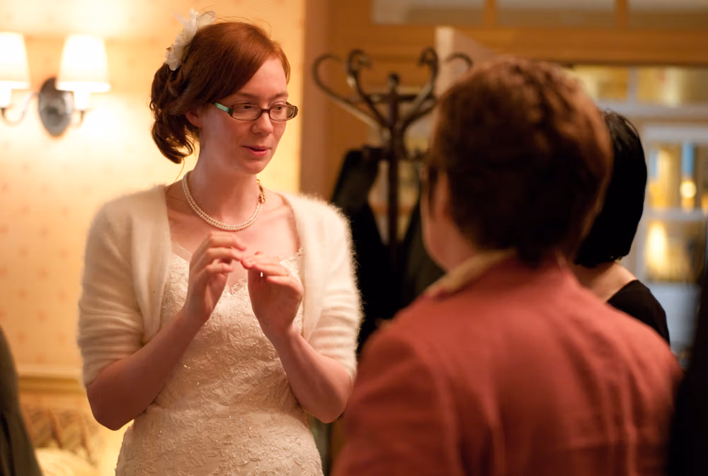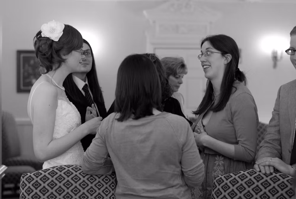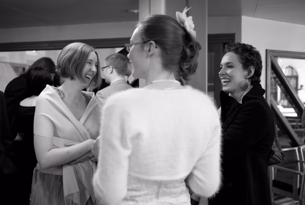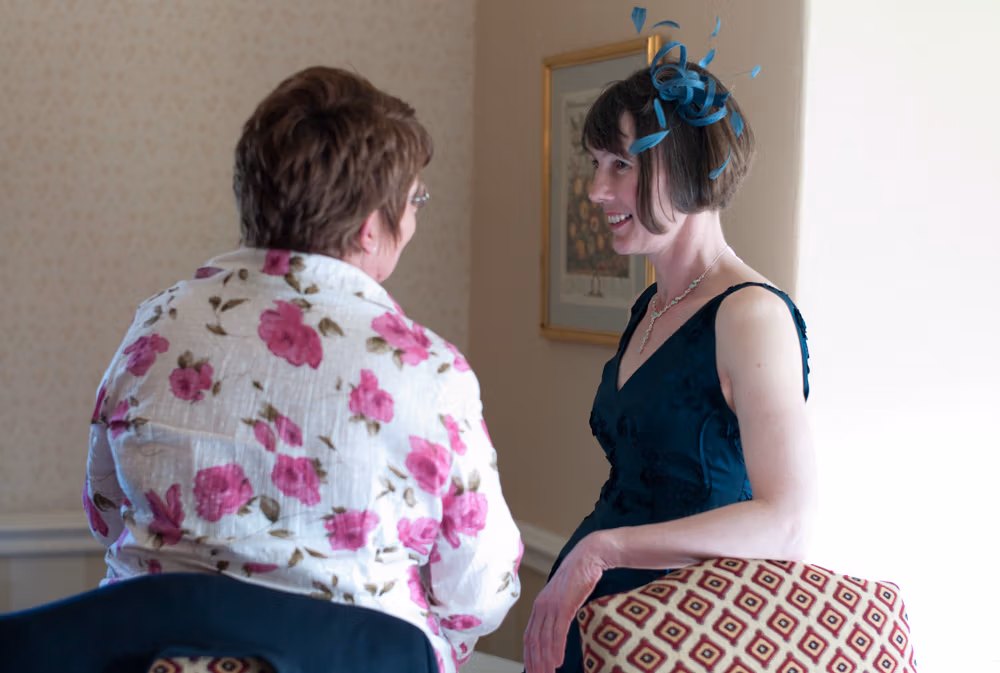 The morning began quietly, with Catherine sharing time with a close friend before the celebrations. A delicate faux pearl necklace was fastened with care, one of those small but meaningful rituals that mark the start of a wedding day.