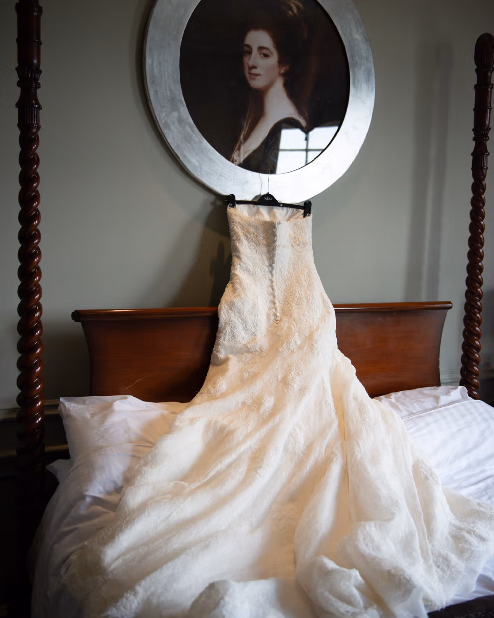 Her dress hung from a picture frame beside the four-poster bed. Waiting. The veil caught gentle window light. Timeless moments that needed no direction.