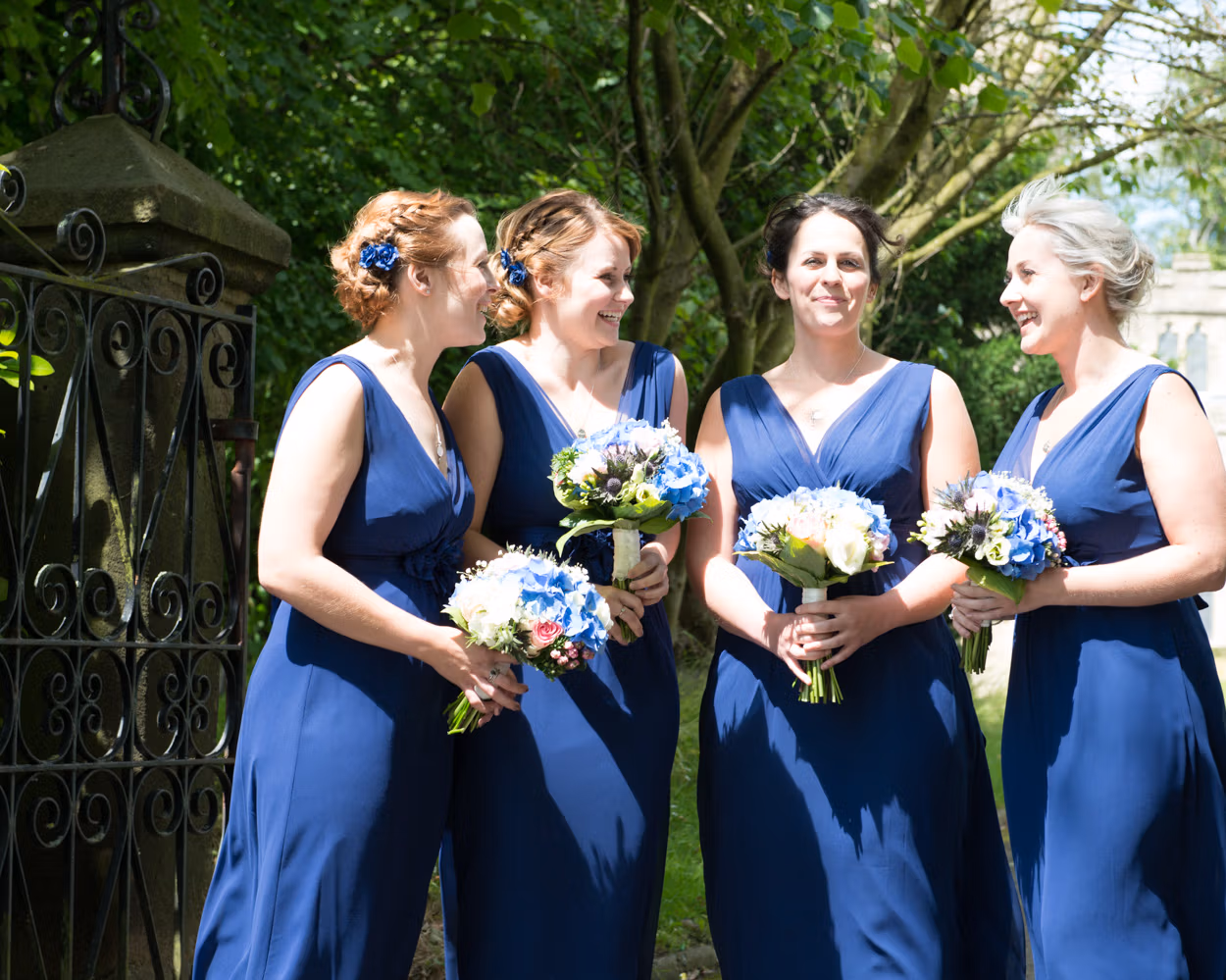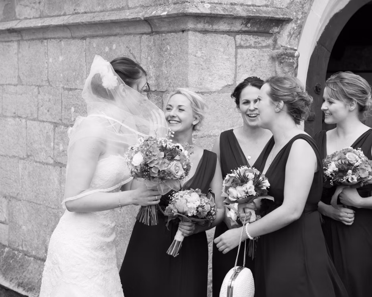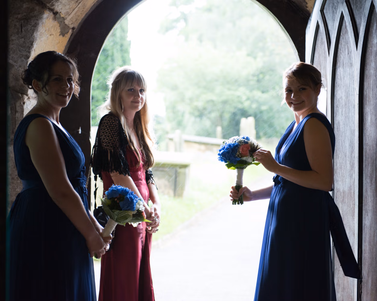 A vintage white Rolls pulled up. Tanya stepped out beaming. She and her bridesmaids walked the path together. All smiles. All excitement. Sunshine exactly where it mattered most.