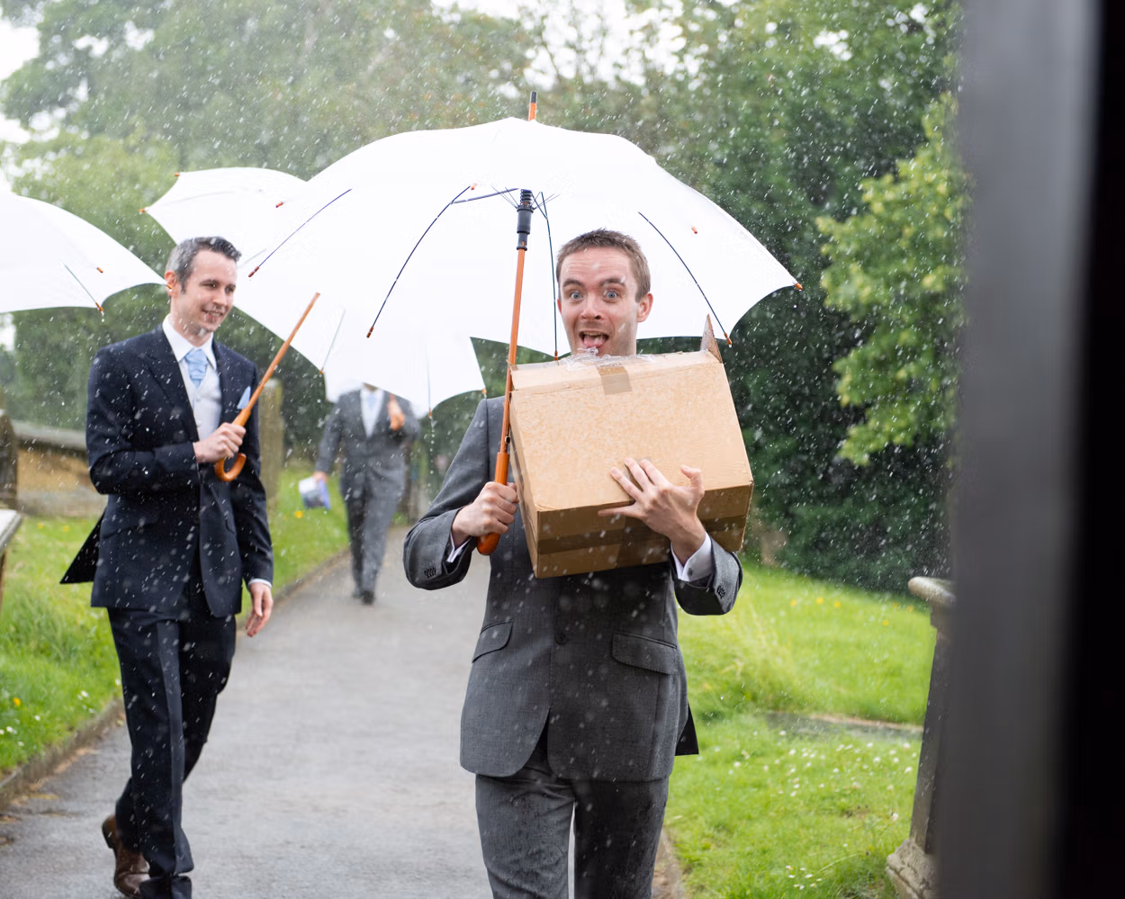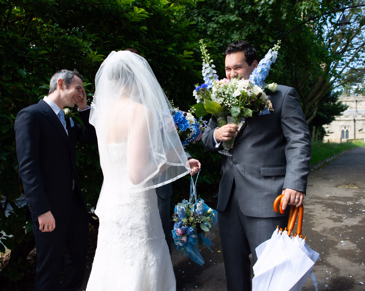 When I arrived, bridesmaids sheltered at the church entrance. A quiet, moody moment. Umbrellas gathered. Groomsmen greeted guests. Some laughed through the drizzle. Others stepped inside, already smiling.