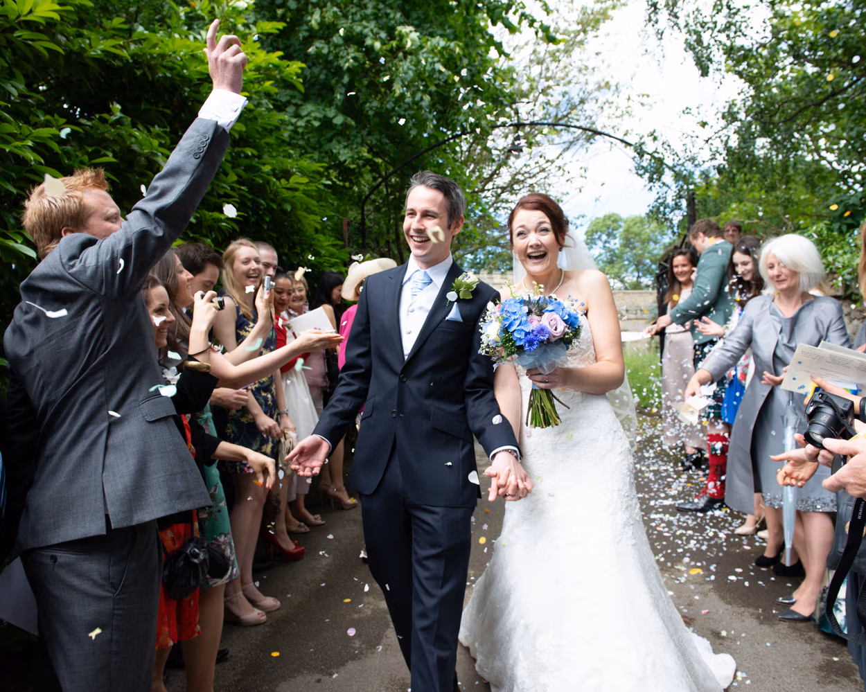 Tanya and Paul stepped through a shower of colour. Friends and family close around them. Smiles everywhere. A moment that barely needed direction.