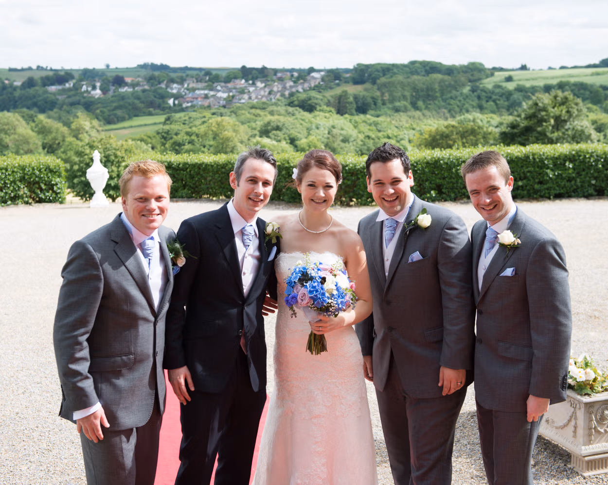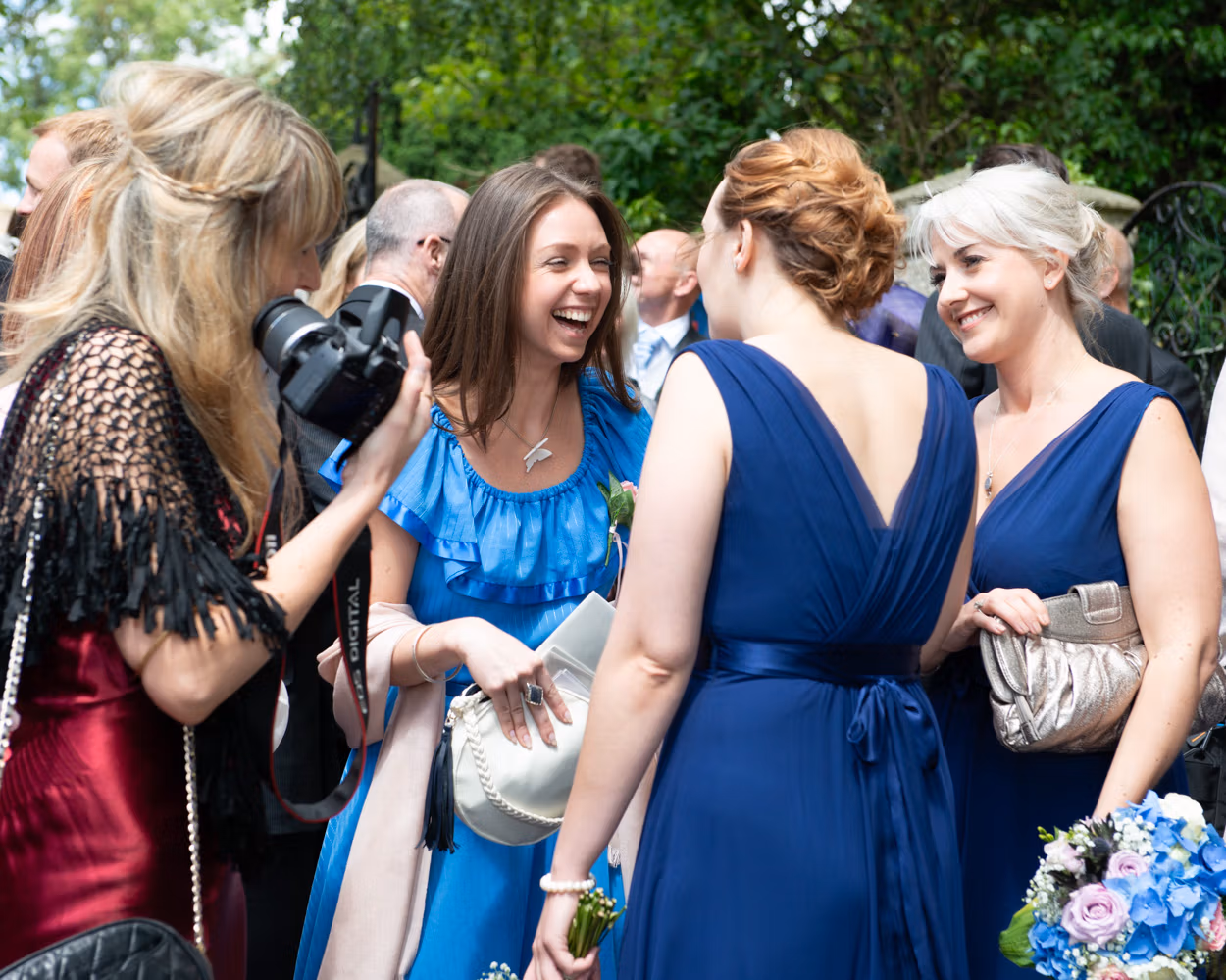 Guests arrived along the pathway. Bright dresses. Green surroundings. A burst of summer colour. Bridesmaids gathered again, this time in warm sunshine.