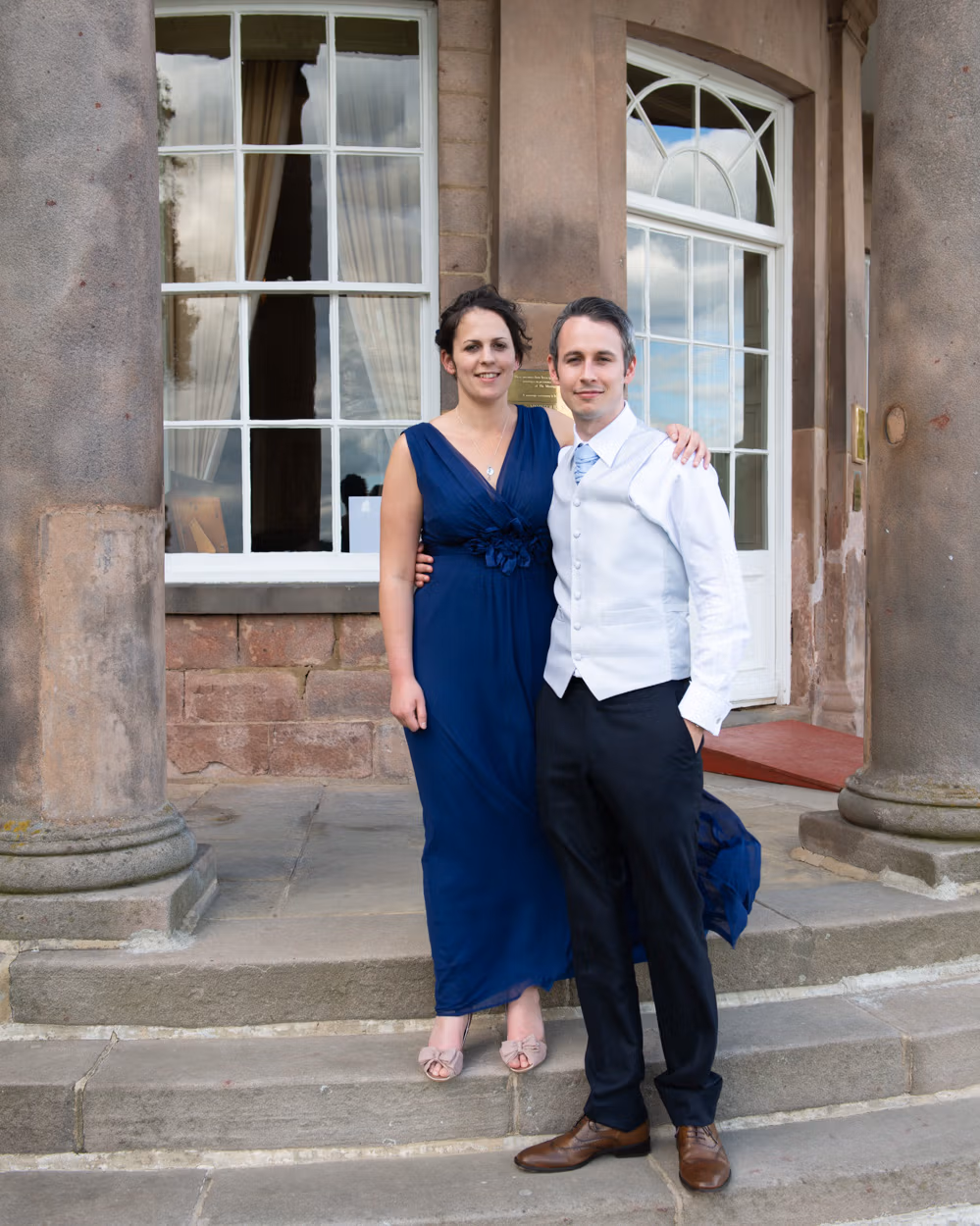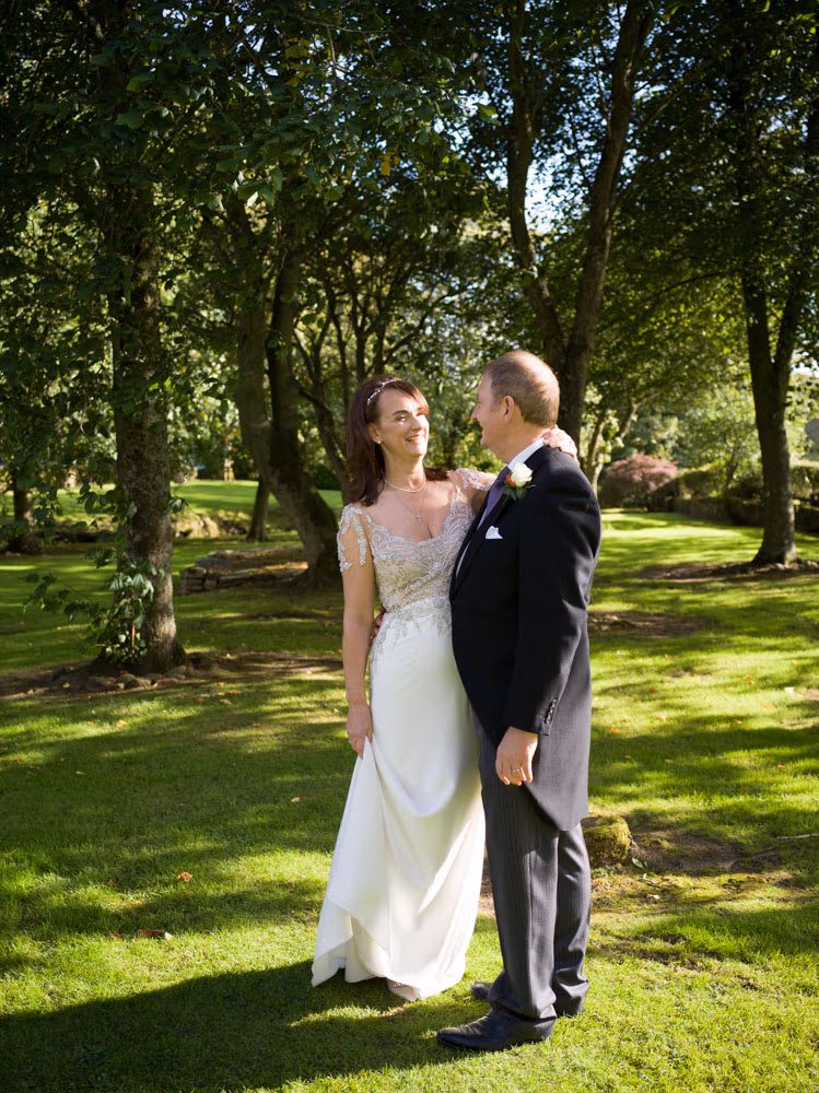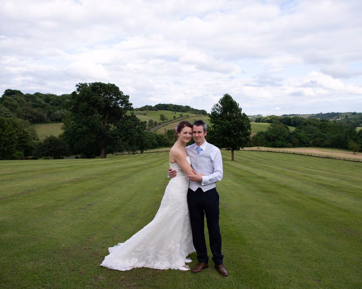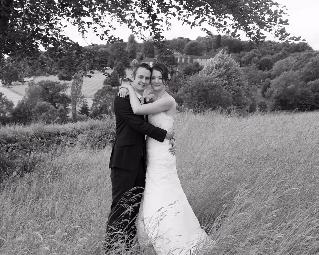 Sweeping lawns. A split tree. Still air. Tanya and Paul together. Calm. Unhurried. Then one last portrait with the hall behind them as dusk began to settle.
