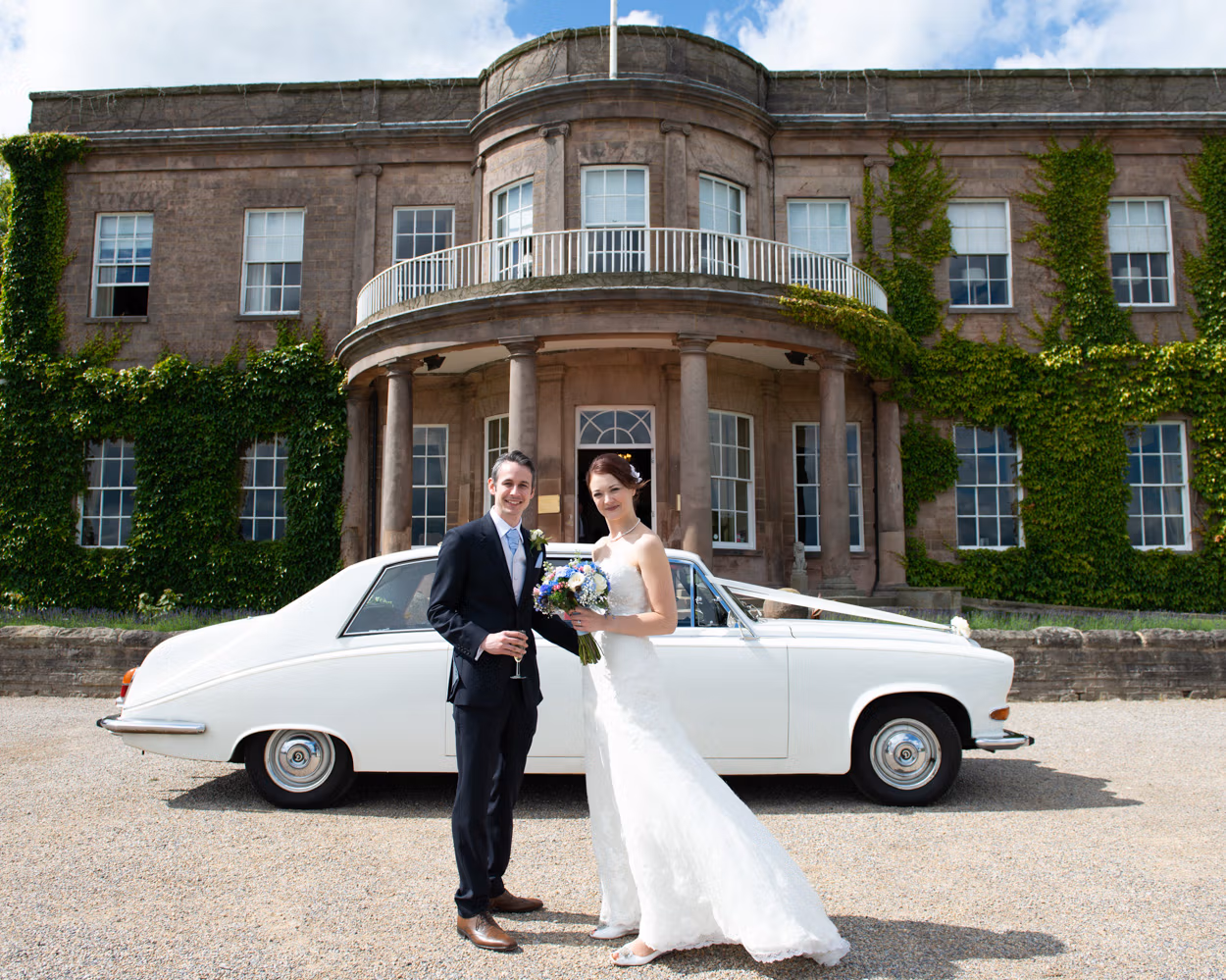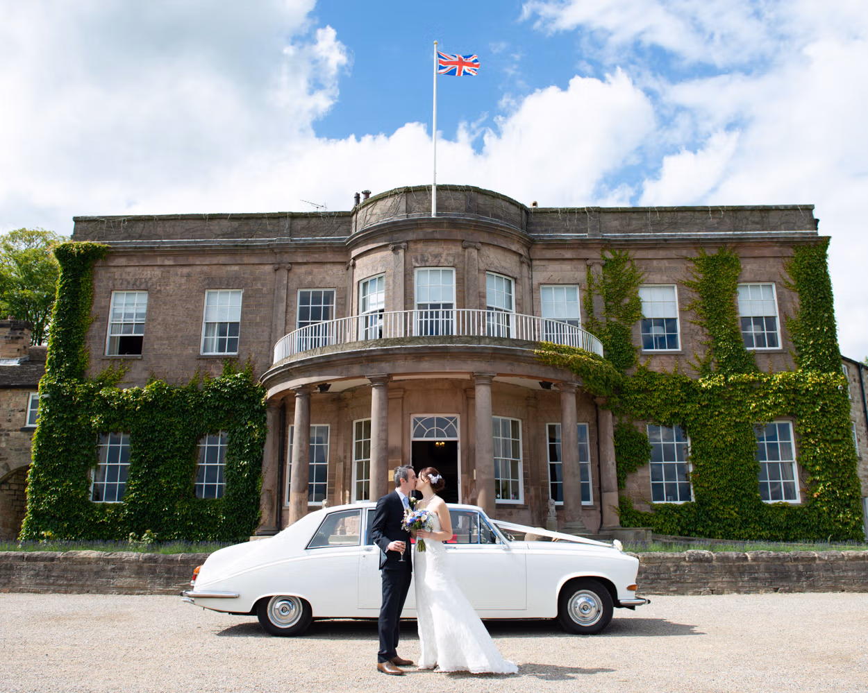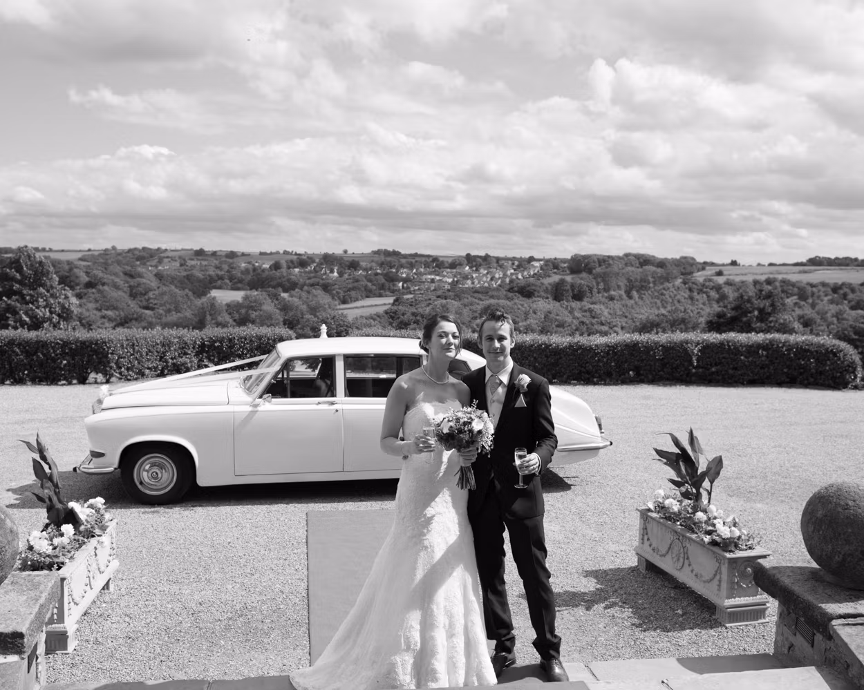 Only minutes later, we arrived at the hall. And, as if on cue, the sunshine returned. Tanya and Paul stepped out beside the vintage Rolls. Relaxed. Natural. A few portraits with Wood Hall behind them. Then closer frames. Expressions that said everything.