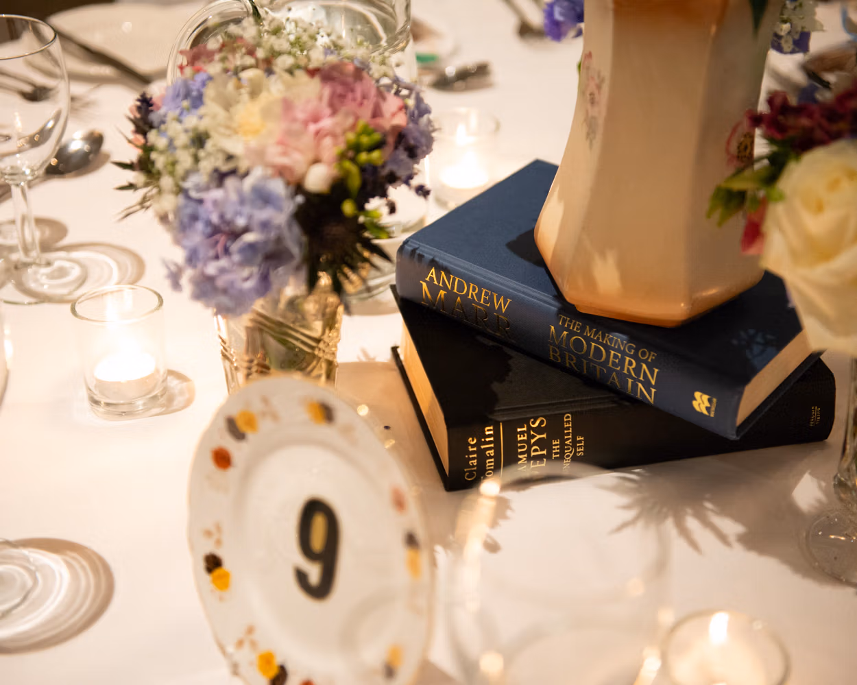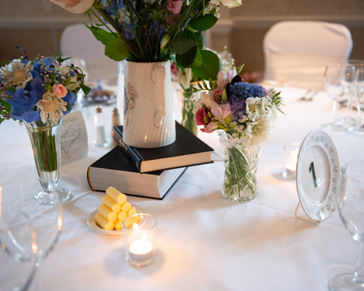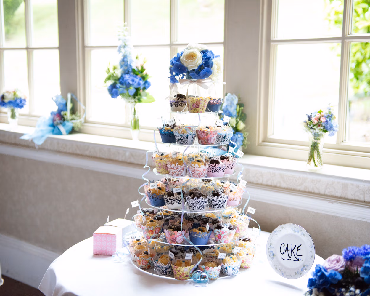The wedding breakfast room at Wood Hall was ready and waiting. Tables dressed simply. Light filling the space. A white iced cake at the centre. Towers of cupcakes beside it. And a hand-felt plate spelling out cake. A small detail that made everyone smile.
