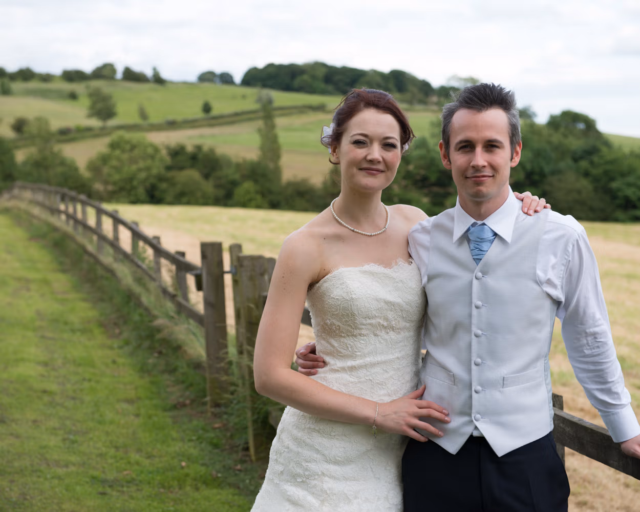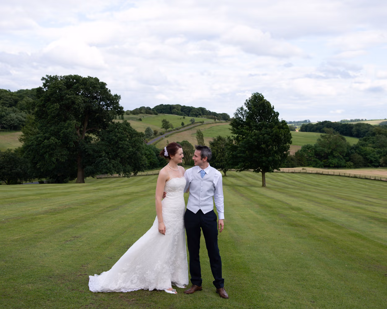 On the way to the venue, we paused at a quiet grassy spot. Wood Hall in the distance. Cloudy skies. A calm moment just for the two of them.