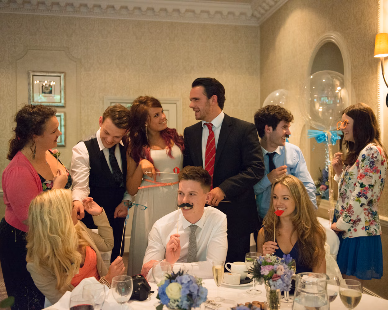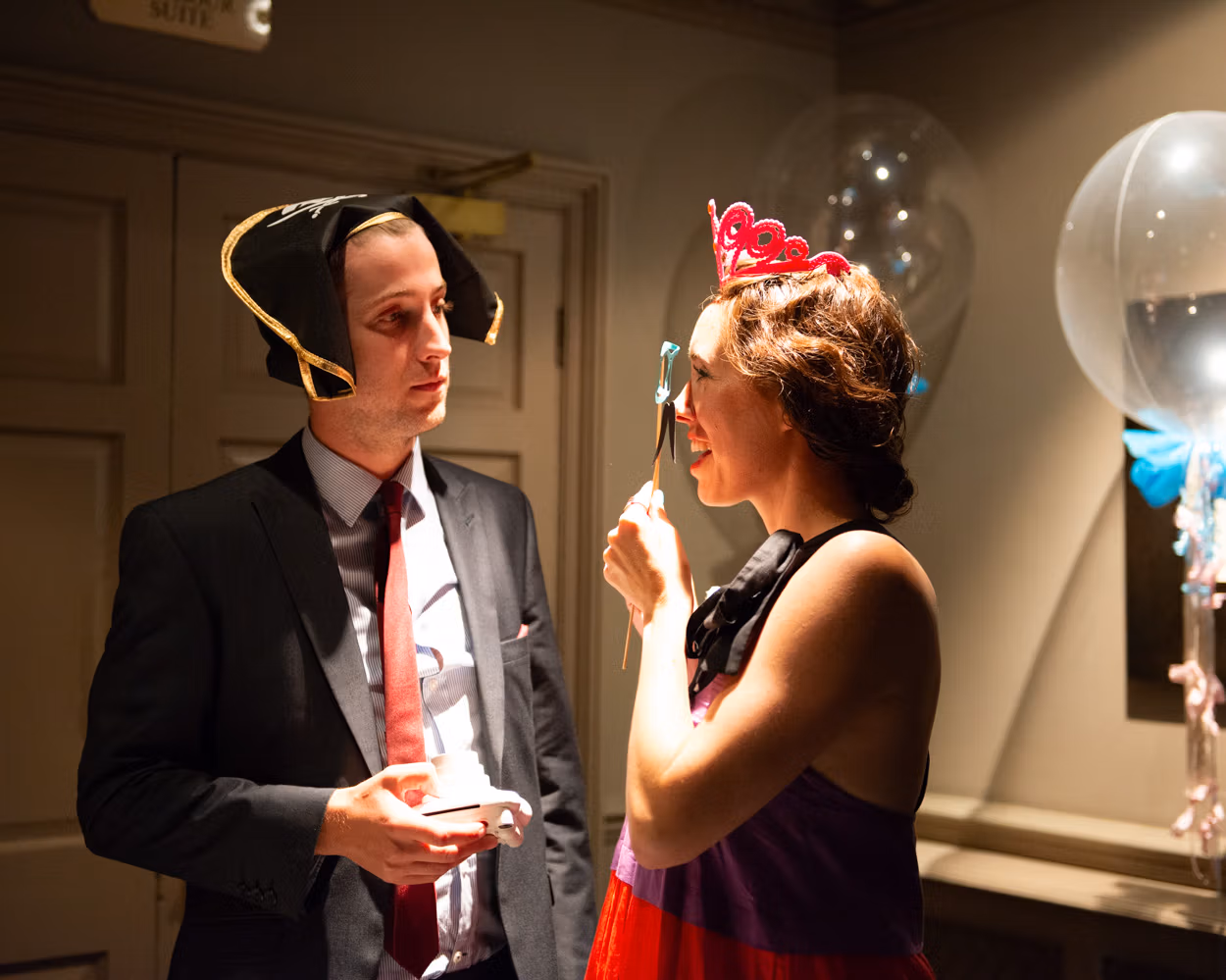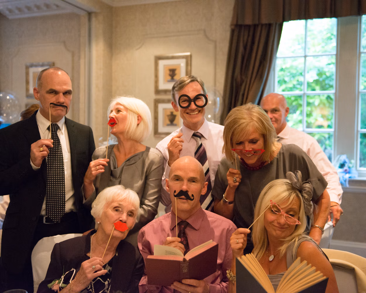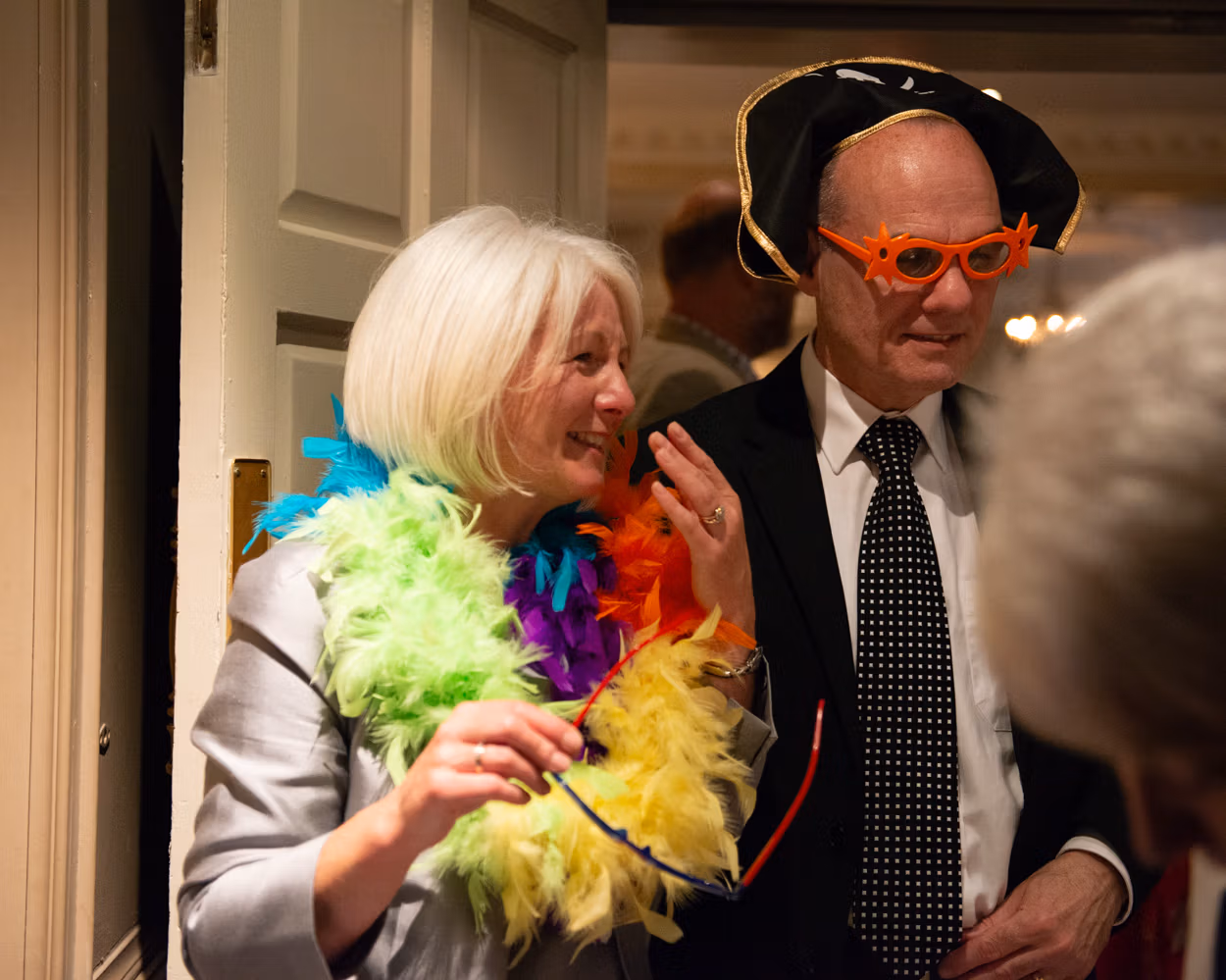Later, guests spread through the rooms. Conversations flowing. Photo-frame selfies. Hats and masks appearing. A few evening guests arriving to fresh excitement. Tanya lifting a leg for a joking pose as friends greeted her. Moments you can’t script.