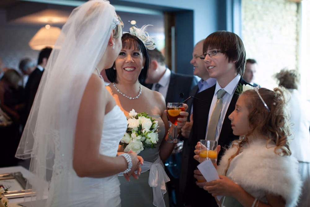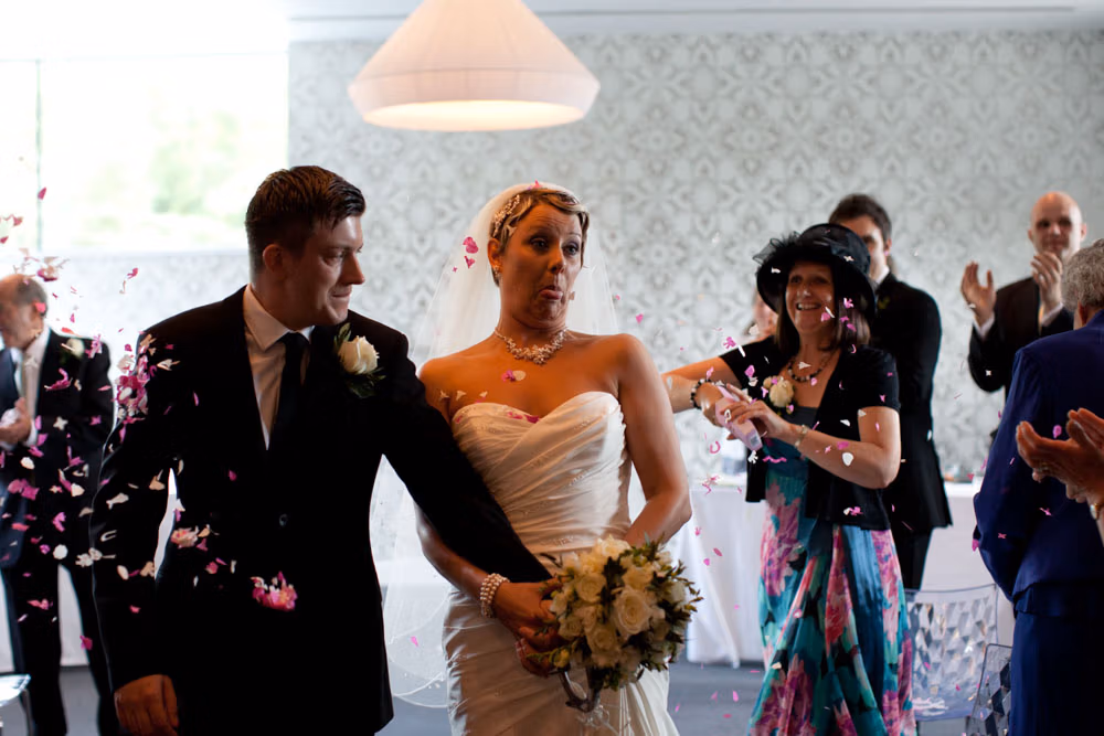 Then came the confetti exit — bursts of laughter, smiles, and playful fun as friends and family showered the newlyweds with good wishes. The couple’s personalities really shone through as they greeted their guests with warm hellos and joyful hugs, making this Yorkshire wedding feel like one big happy celebration.