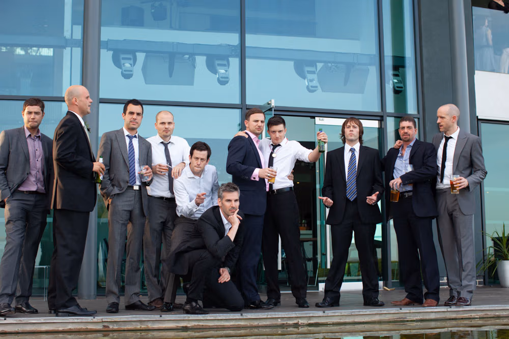 The ceremony began with a stylish line-up — the groom and his groomsmen looking casually sharp in black suits and cream rose buttonholes, ready to welcome guests with big smiles.